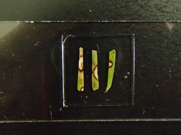Bệnh cháy lá ở cỏ là do loại nấm Curvularia geniculata gây ra, Curvularia geniculata là một loại nấm biến hình phát triển nhanh trong bộ Ascomycota, được tìm thấy nhiều nhất trong đất, đặc biệt là ở những khu vực có khí hậu ấm. Curvularia geniculata chủ yếu gây nhiễm trùng động thực vật và hiếm khi gây nhiễm trùng cho người. C. geniculata được đặc trưng bởi các bào tử cong, có tâm màu nâu sẫm và các đầu thuôn nhọn màu nhạt