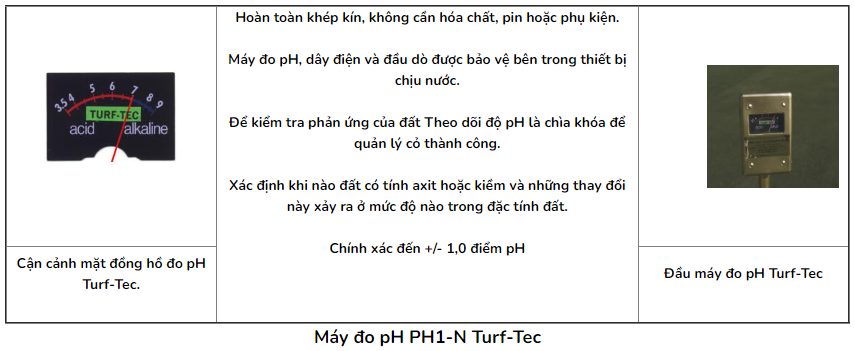 Máy đo pH Turf-Tec lý tưởng để thực hiện nhiều bài đọc nhanh chóng tại hiện trường. Nếu những thay đổi đáng chú ý trong chỉ số pH xảy ra từ vị trí thí nghiệm này sang vị trí thí nghiệm khác về pH của đất, thì các mẫu từ các khu vực nghi ngờ đó có thể được lấy và phân tích thêm thông qua trộn bùn hoặc đưa mẫu đến phòng thí nghiệm được công nhận để phân tích.